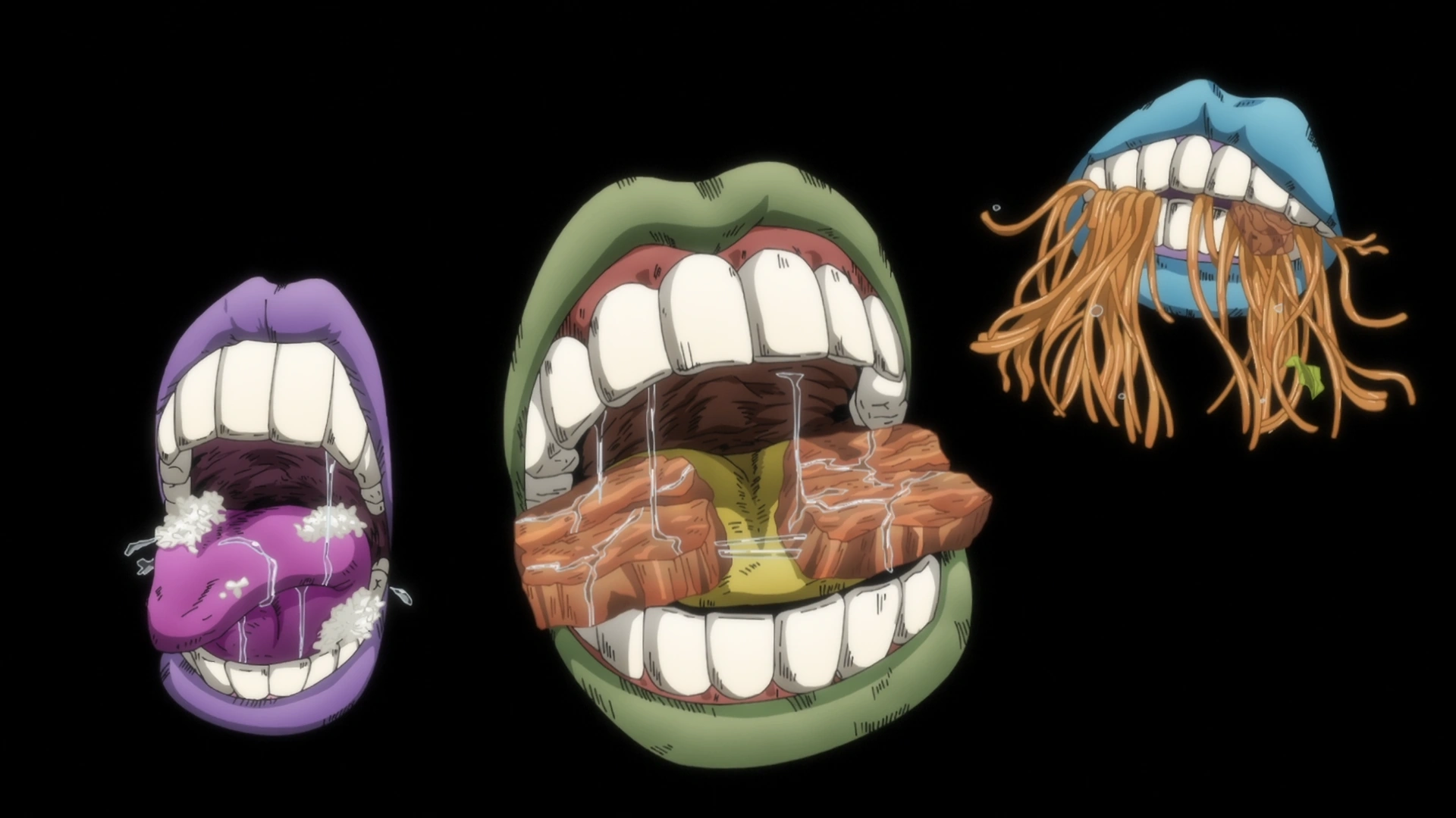 Eat's appearance remains unknown, but is represented by a trio of mouths in the middle of eating food. In the anime, the mouths are all given different colors of purple, green, and blue.