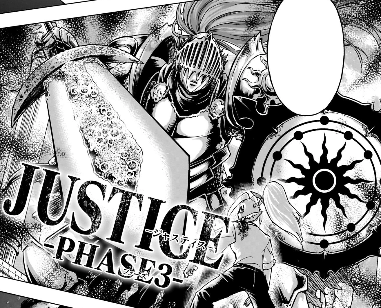 When they reach Phase 3, Justice's size increases, transforming into a hulking giant; their armor changes shape, becoming more elaborate and with sun-shaped symbols on the shoulder pads, while their helmet becomes a sort of visor, revealing a thick ponytail on the back of the head and the lower part of their face. Their sword also increases in size, and along with it, a shield appears, also with a sun-shaped symbol on its surface.