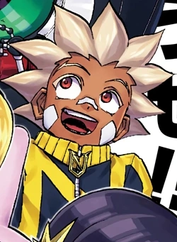 Top is a dark-skinned teenager with bandages on his face. He has wild blonde hair, along with strangely shaped angled eyebrows. He wears a black and yellow tracksuit with the union symbol on the front of his jacket.